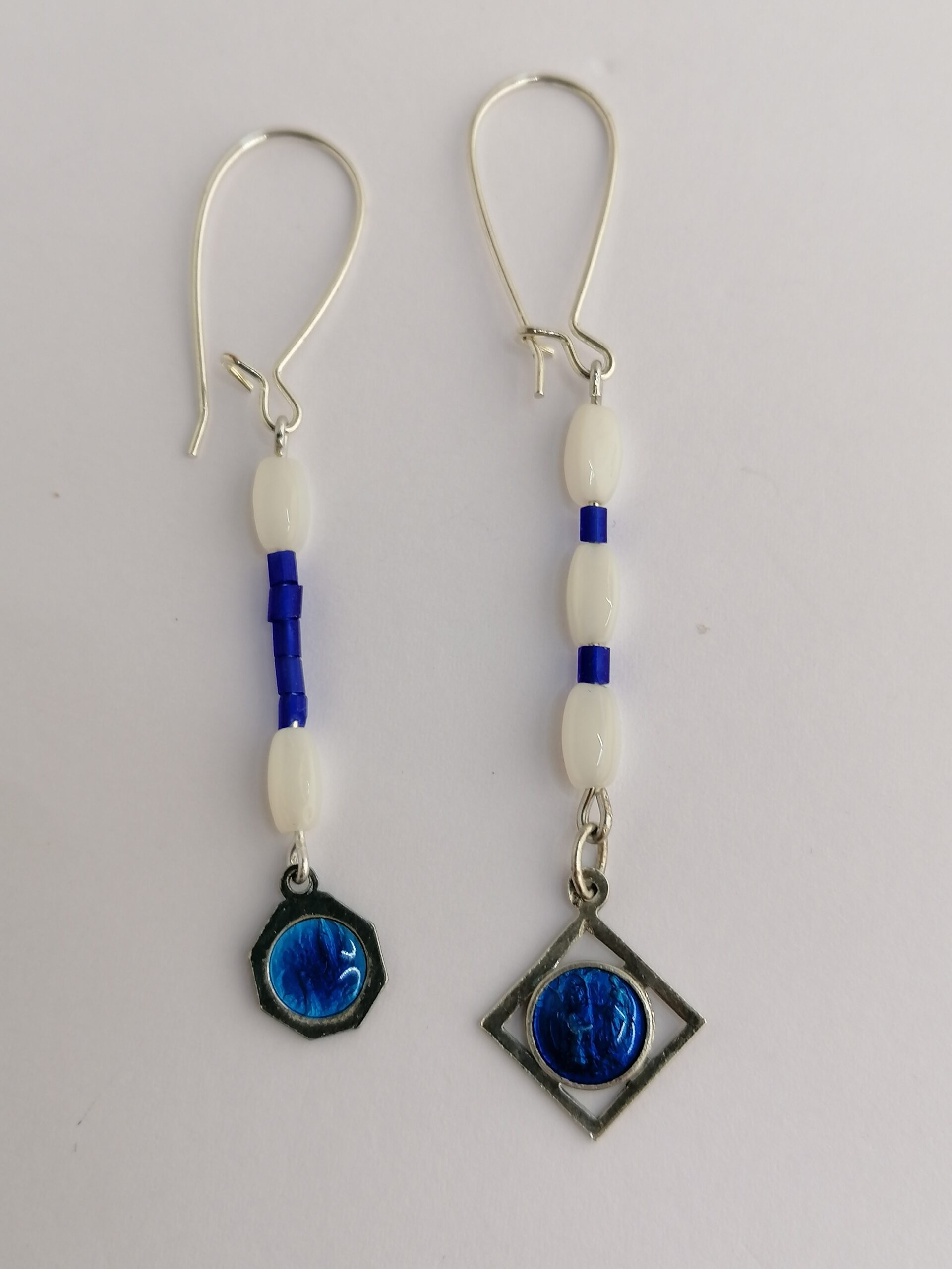 Boucles d’oreille kitch. Paire asymétrique : perles nacre et verre de Murano. Petites médailles religieuses métal émaillé bleu. Attaches plaqué argent.