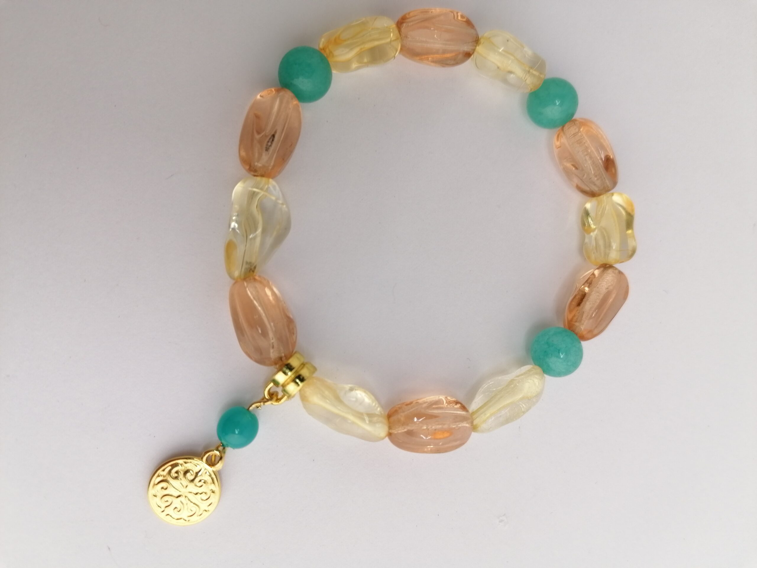 Bracelet monté sur élastique. Perles vintage verre torsadé, coloris pastels, beige et jaune. Perles vertes en aventurine. Breloque médaille plaqué or 24 k.