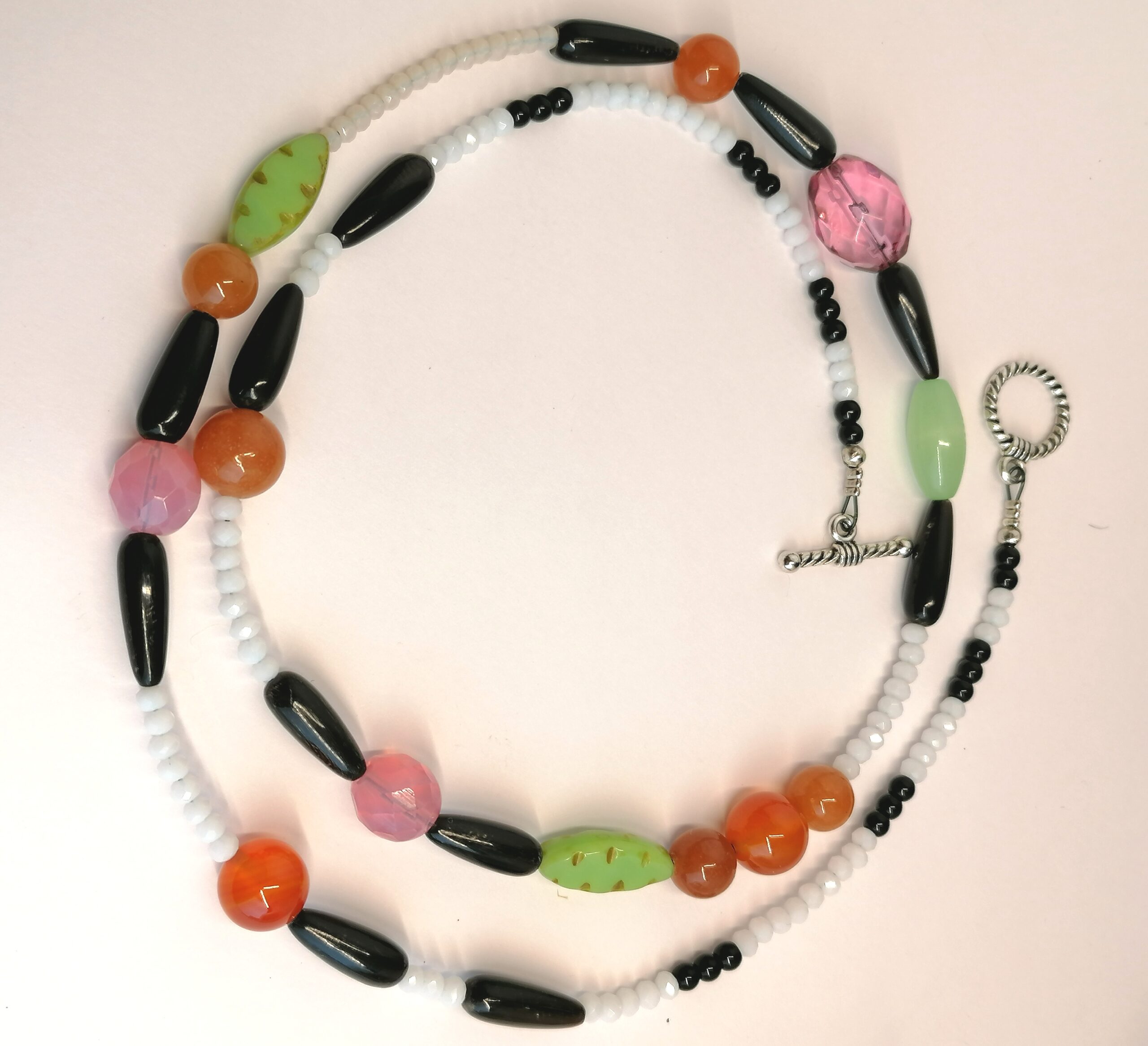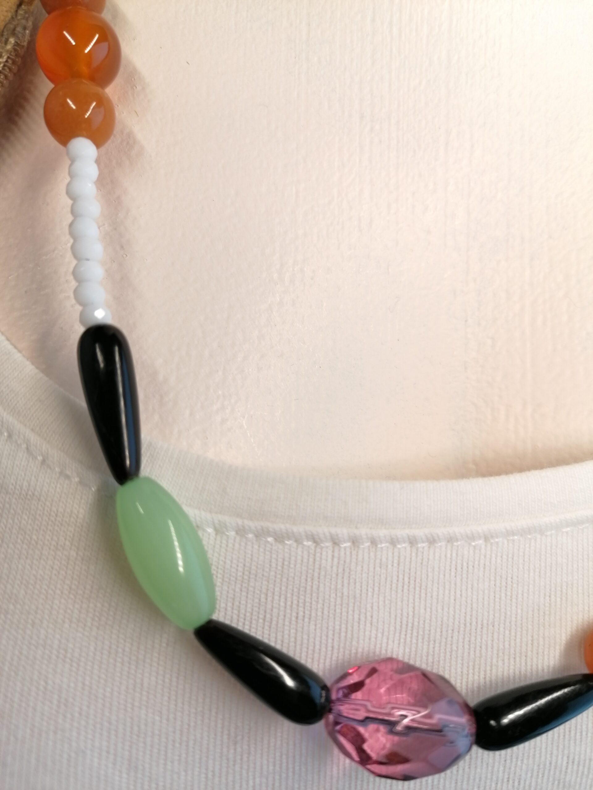 Collier composé de nombreuses perles de différentes formes et couleurs, verre vintage, cristal, bakélite vintage, cornaline, tourmaline. Fermoir toogle acier argenté