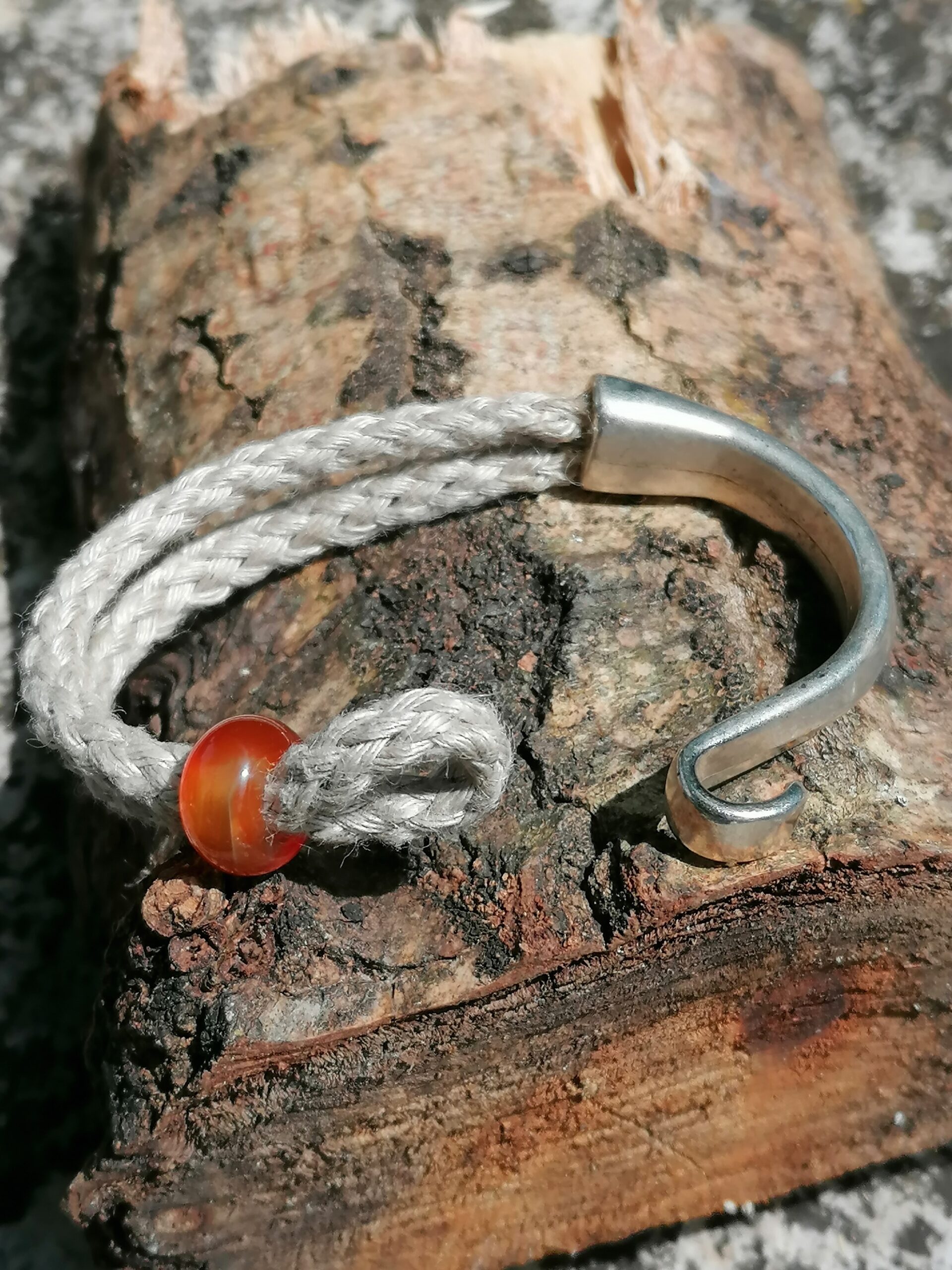 Bracelet composé d’une cordelette de lin raccordée à 2 pièces de métal comprenant un crochet. Un anneau en agate resserre la boucle de la cordelette qui se fixe sur le crochet. Se porte ajusté.