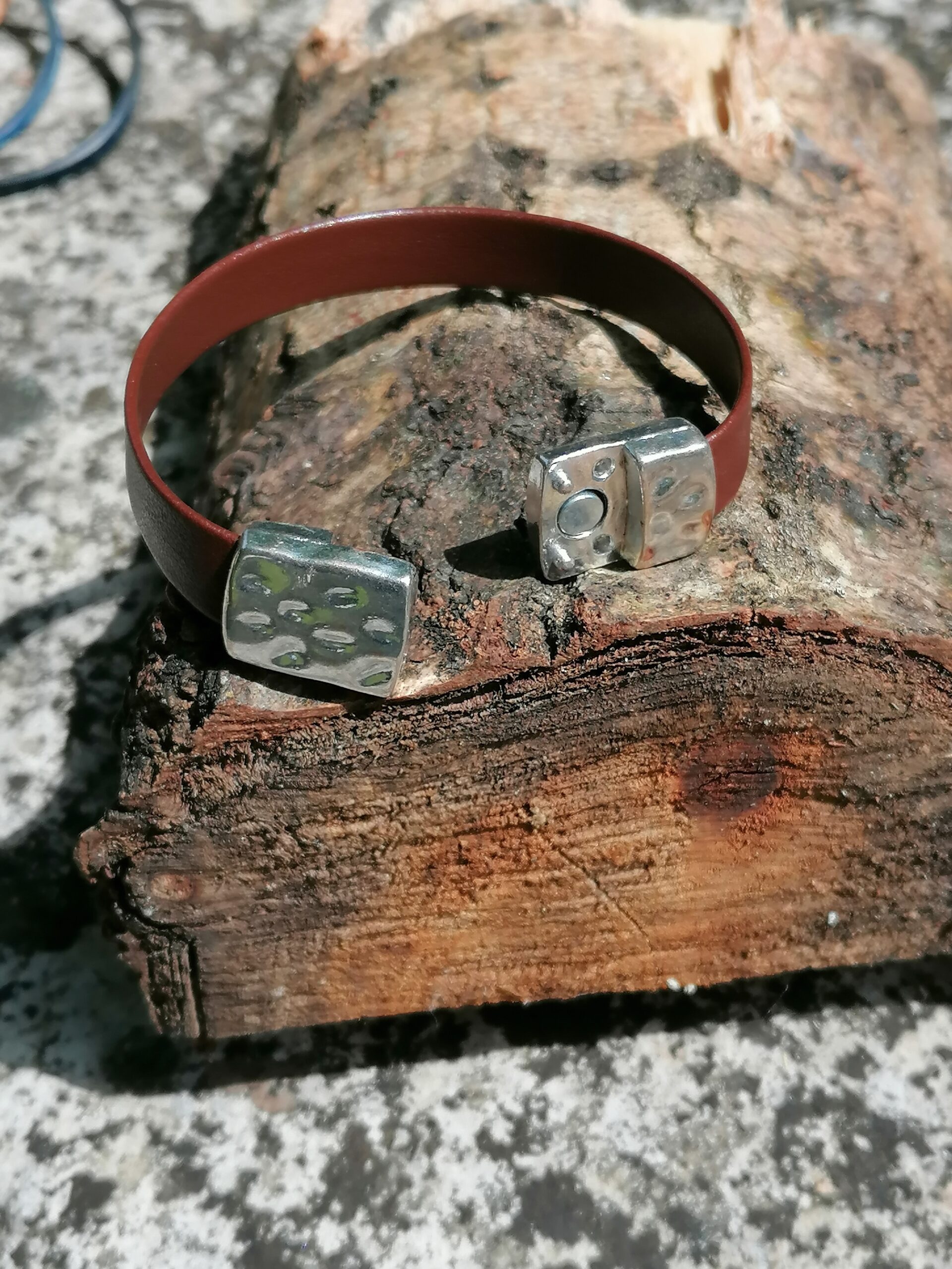Bracelet composé d’une lanière en cuir fin, coloris marron, et d’un fermoir en zamac martelé. Fermeture par aimant robuste.
