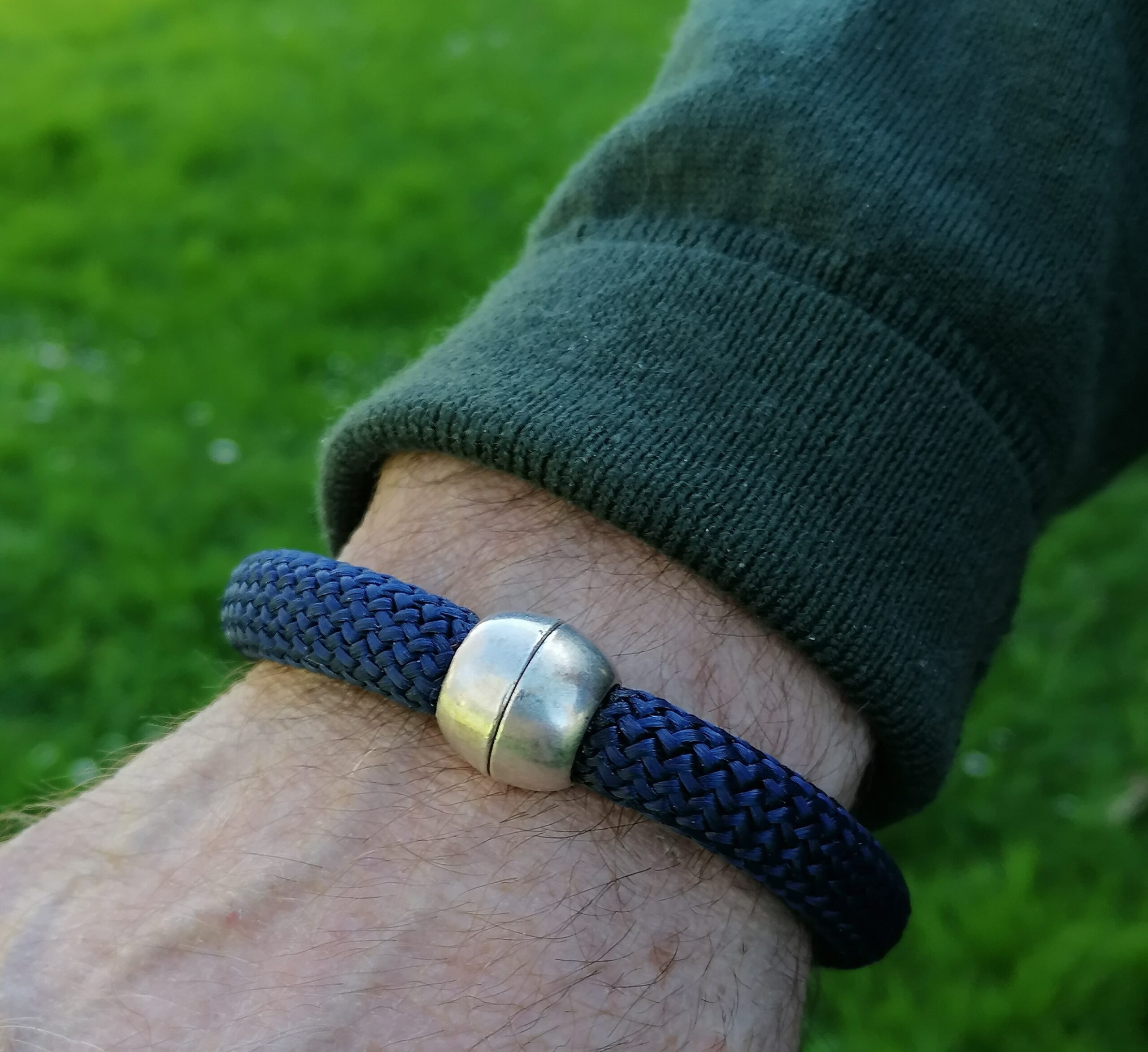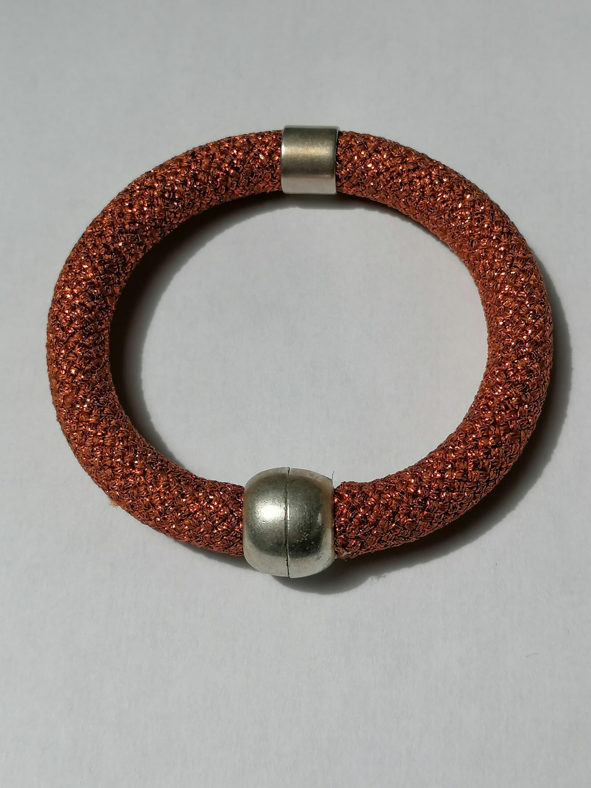 Bracelet souple, cordage tressé, orné d’un fermoir boule en acier argenté, aimant très efficace. Coloris kaki, existe aussi en marine, rouge et pailleté cuivre (voir la galerie)