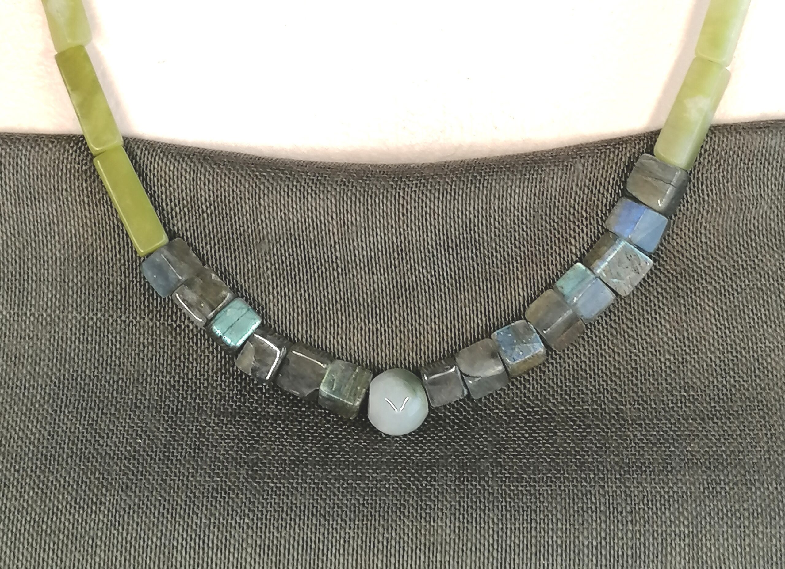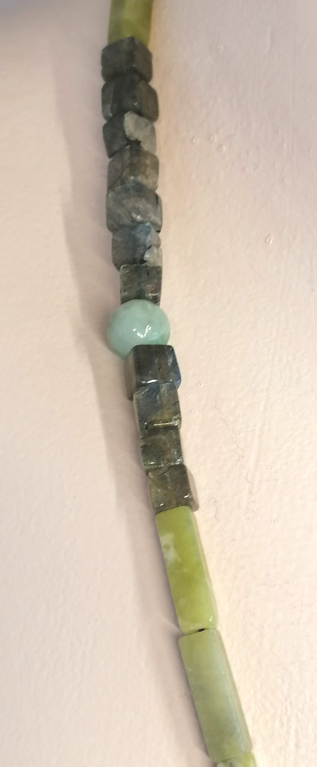Collier long composé de perles « baguette » en jade, de perles carrées en labradorite et rondes en aventurine.