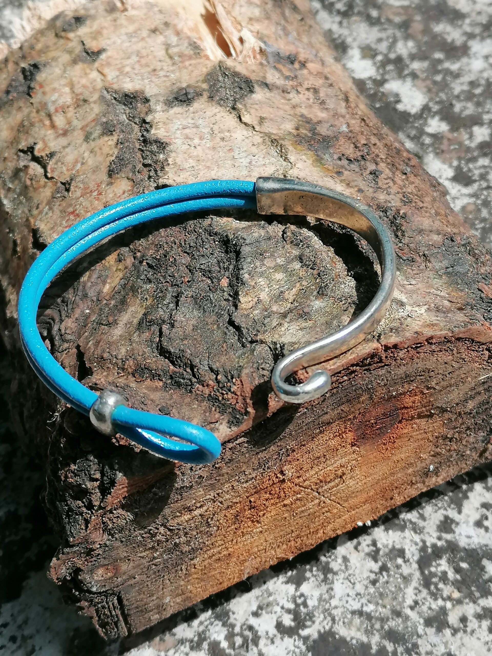 Bracelet composé d’un double cordon en cuir rond (3mm de diamètre) qui s’attache à une pièce en acier semi circulaire comportant un crochet. Un passant en acier maintient la boucle du cuir.