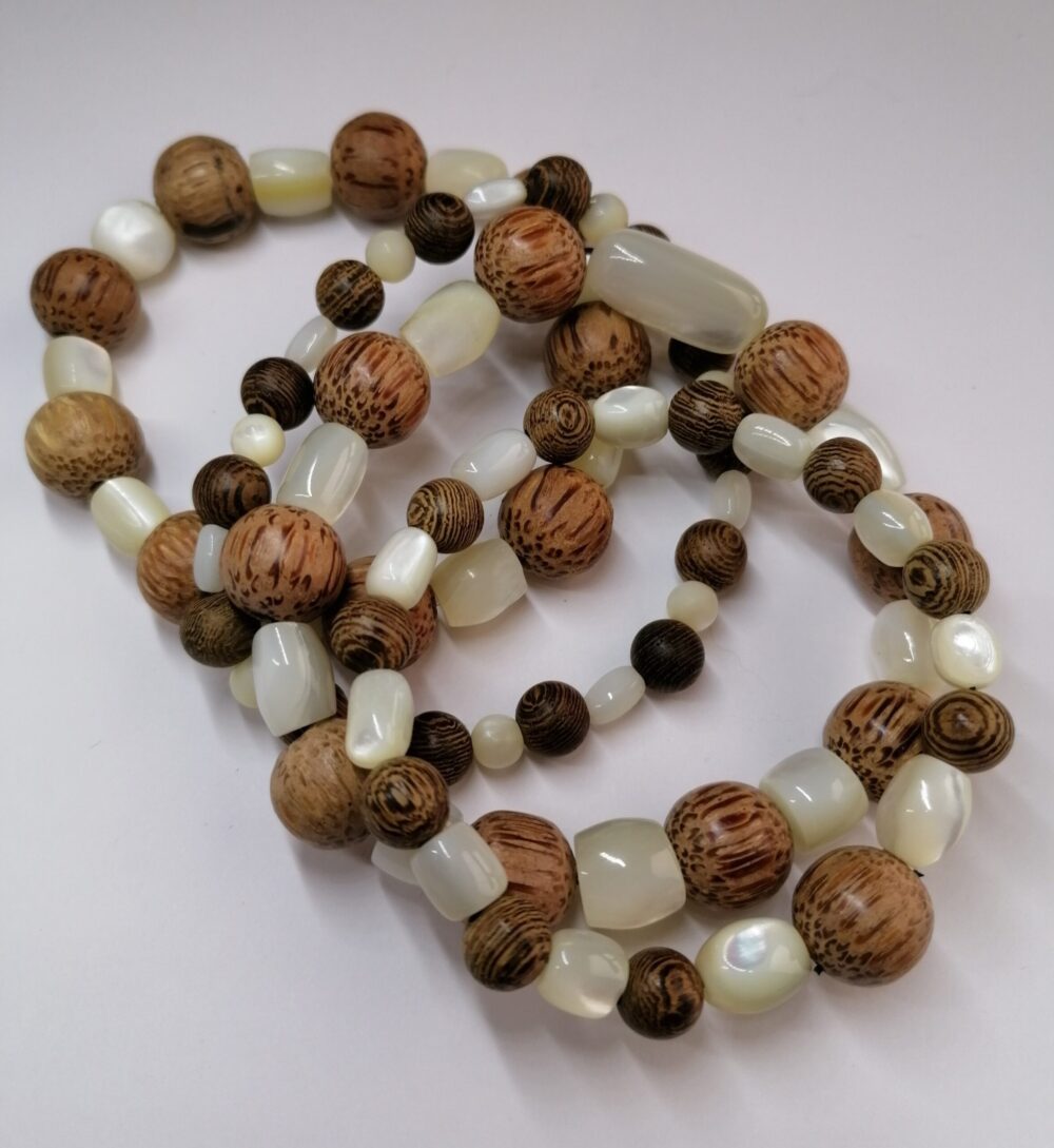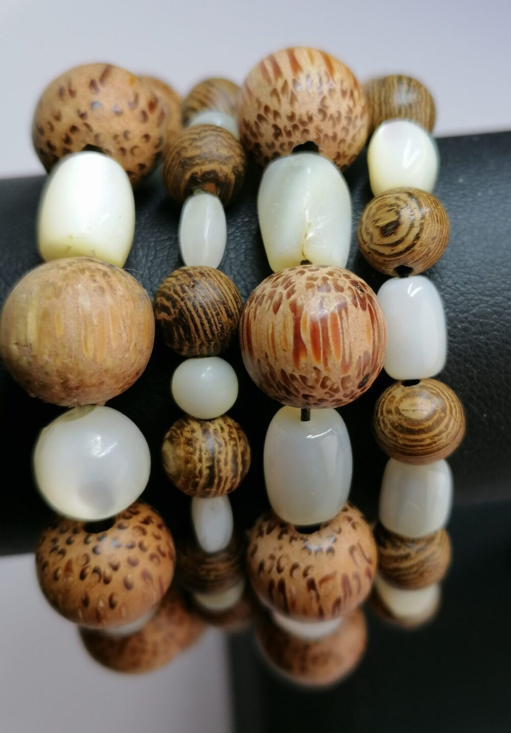 Bracelet monté sur élastique, composé de perles de nacre anciennes et de perles de bois de bambou.