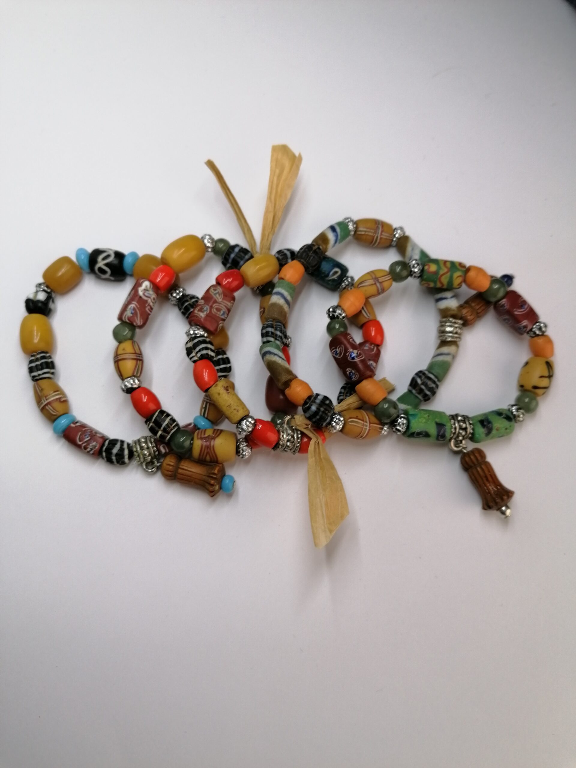 Bracelet bohème vintage, composé de perles de commerce vénitien, de perles en métal travaillé et d’un pompon en buis.
