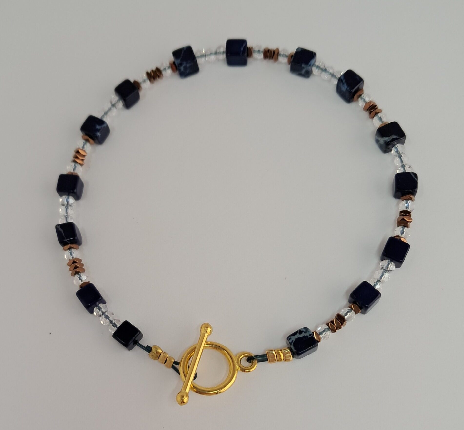 Bracelet composé de perles cubes en jaspe impérial bleu, de petits cristaux transparents à facettes et de mini rondelles d’hématite coloris cuivre foncé.