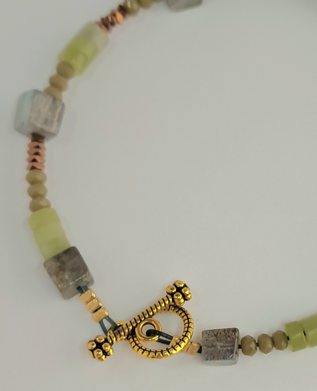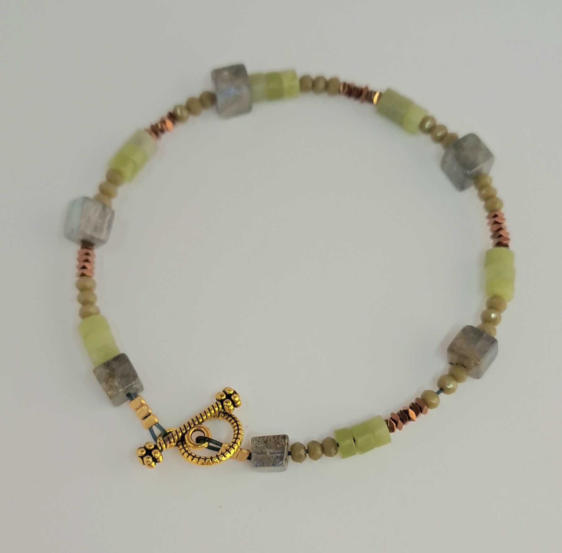 Bracelet composé de petites perles cubes de labradorite, de rondelles de jade et de perles à facettes de cristal et de mini perles d’hématite teintée cuivre.