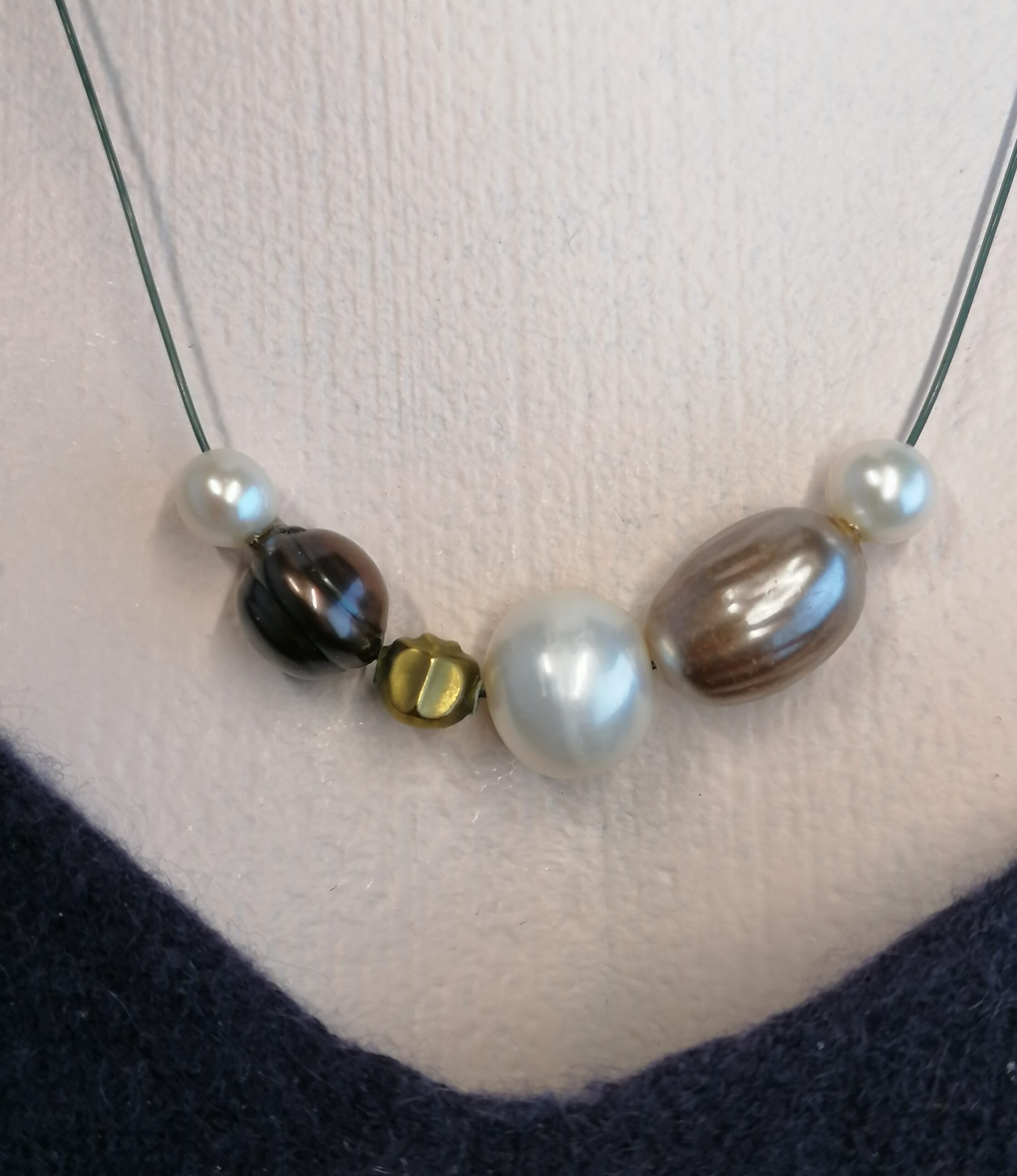 Collier minimaliste, composé de 6 perles dont 5 d’eau douce et 1 en métal argenté vintage. Montées sur fil de nylon.