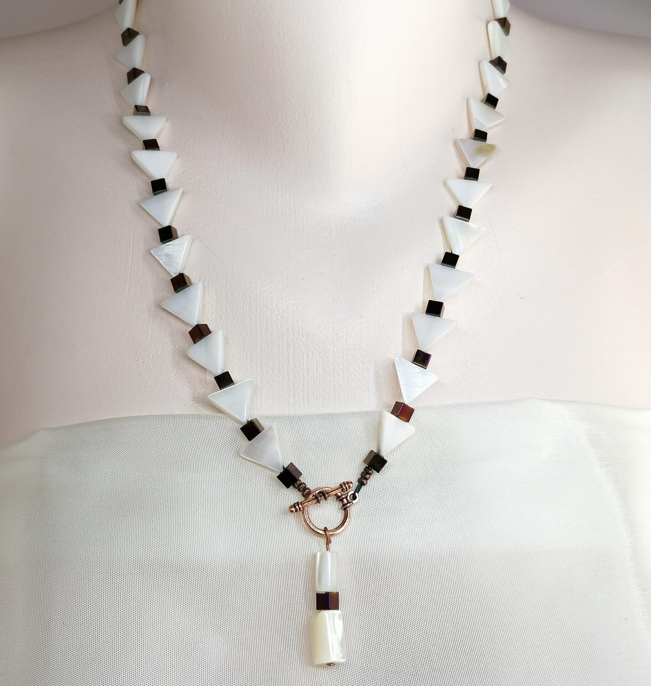 Collier composé de perles « triangle » de nacre blanche et de perles cubiques d’hématite teintée. Fermoir toogle sur le devant en acier coloris cuivre, supportant un pendentif de perles tambour en nacre vintage.
