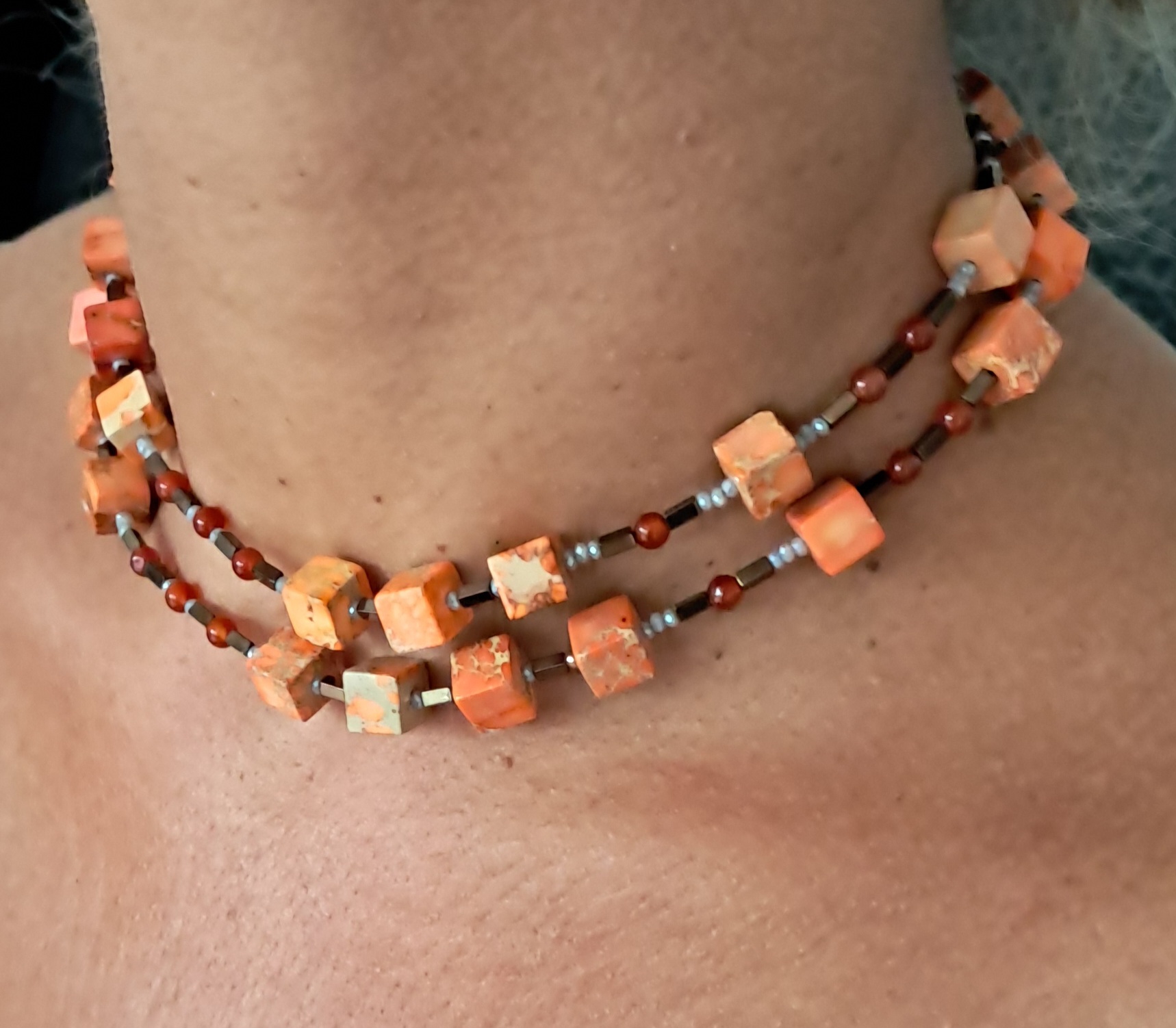 Collier long/ sautoir composé de perles cubes en jaspe impérial orangé. Petites perles, rondes intercalaires en cornaline, mini tubes d’hématite teinte cuivre et petits cristaux gris clair à facettes.