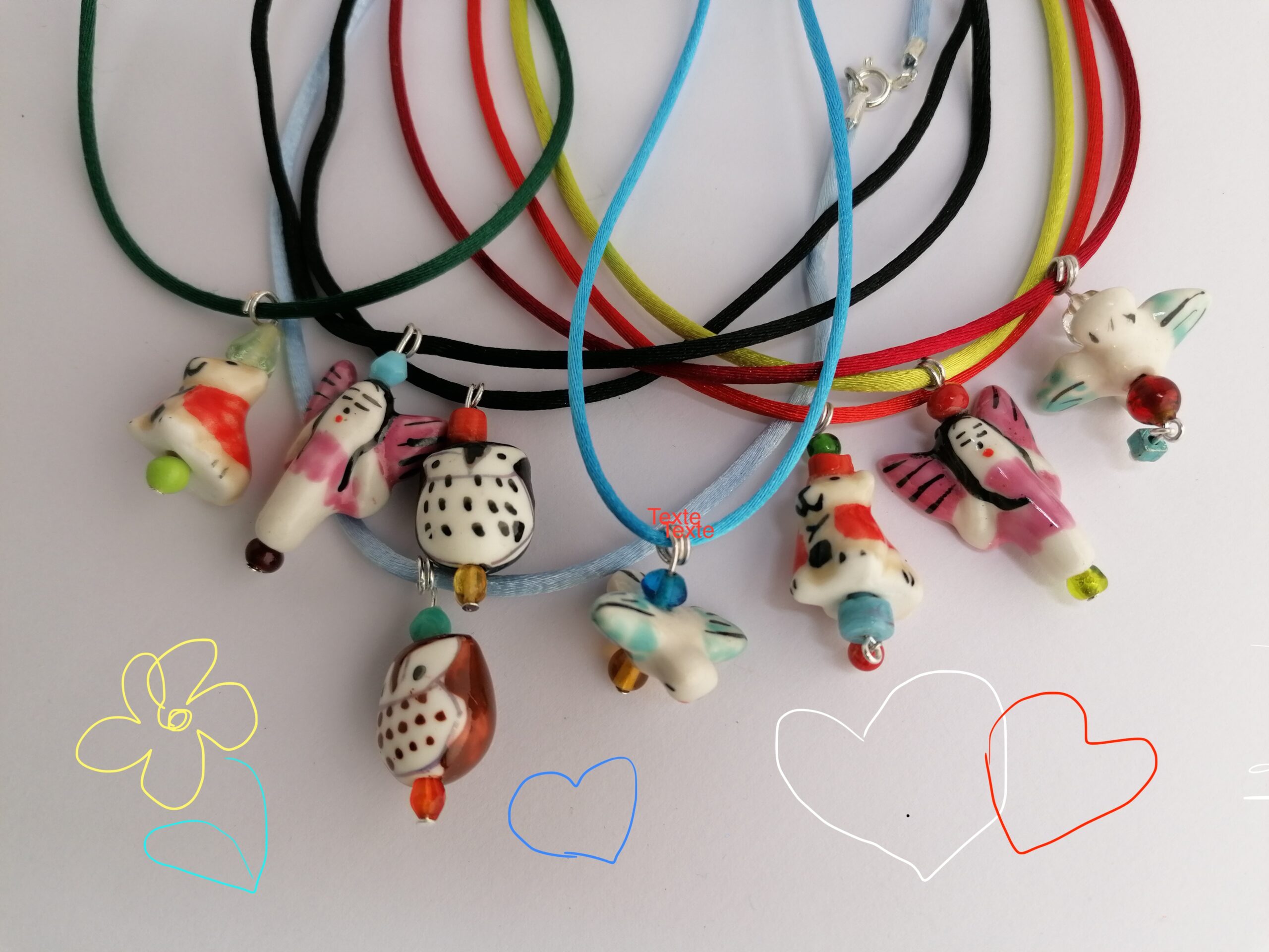 Collier composé d’un petit pendentif « oiseau » en porcelaine monté sur un cordon en soie rouge avec fermoir à ressort.