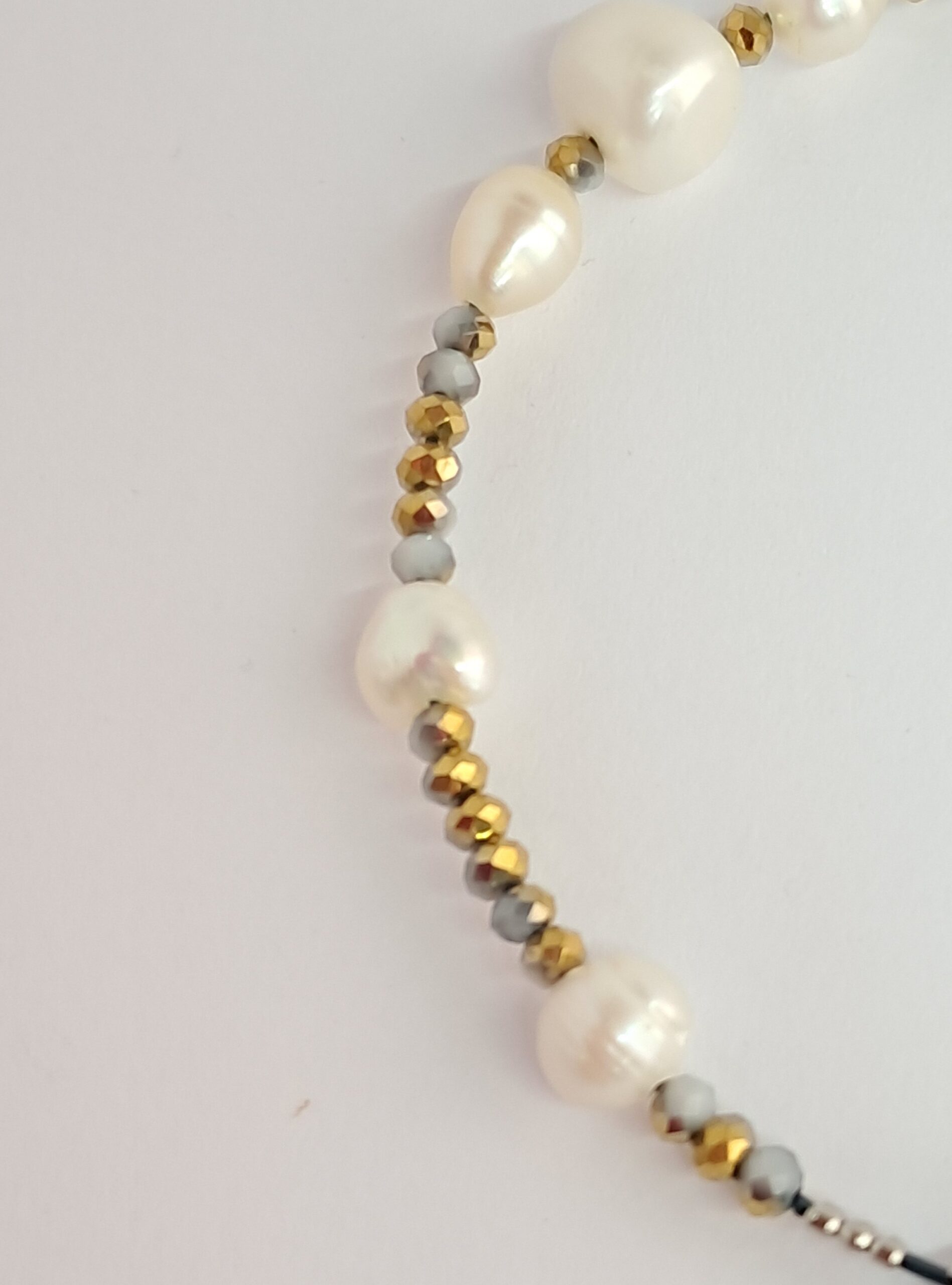 Bracelet composé de perles d’eau douce, de petit cristaux mordorés et d’une breloque goutte en verre à facettes