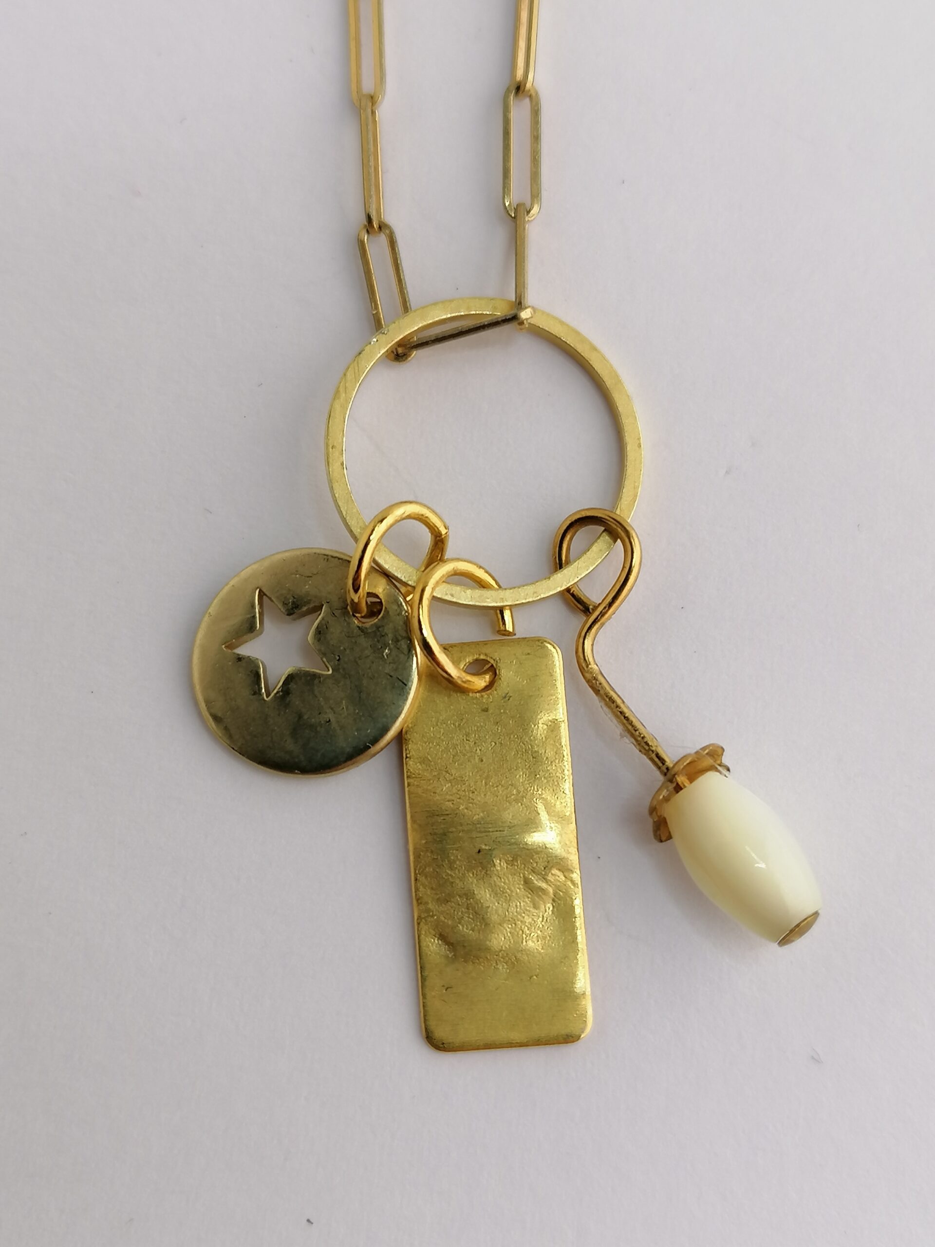 Chaine maille rectangle et anneau plaqués or. Breloques laiton plaqué or et nacre.